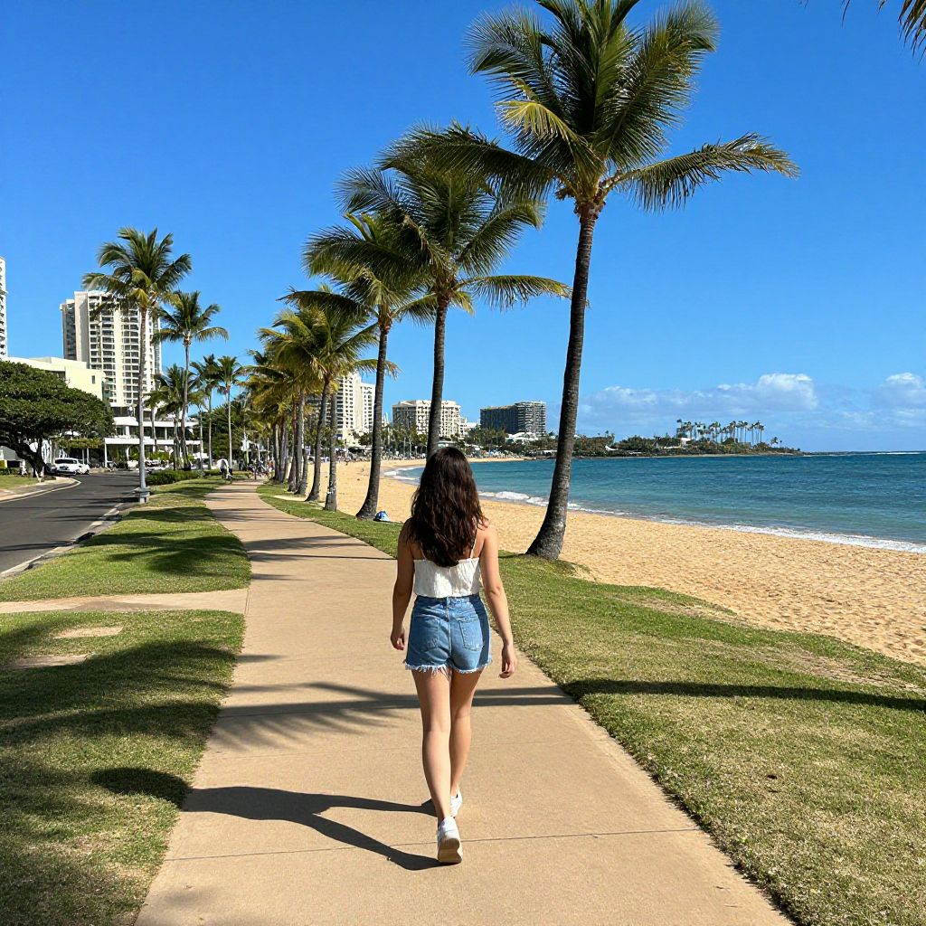 Photograph of a woman with long, dark hair walking away on a sidewalk beside a beach. She wears a white tank top and denim shorts, with white sneakers. The bright blue sky and tall palm trees line the right side of the path, while a sandy beach and calm ocean stretch out on the left. In the background, modern white high-rise buildings are visible. The sunlight casts clear, sharp shadows on the sidewalk and grass. The scene exudes a tropical, sunny atmosphere.