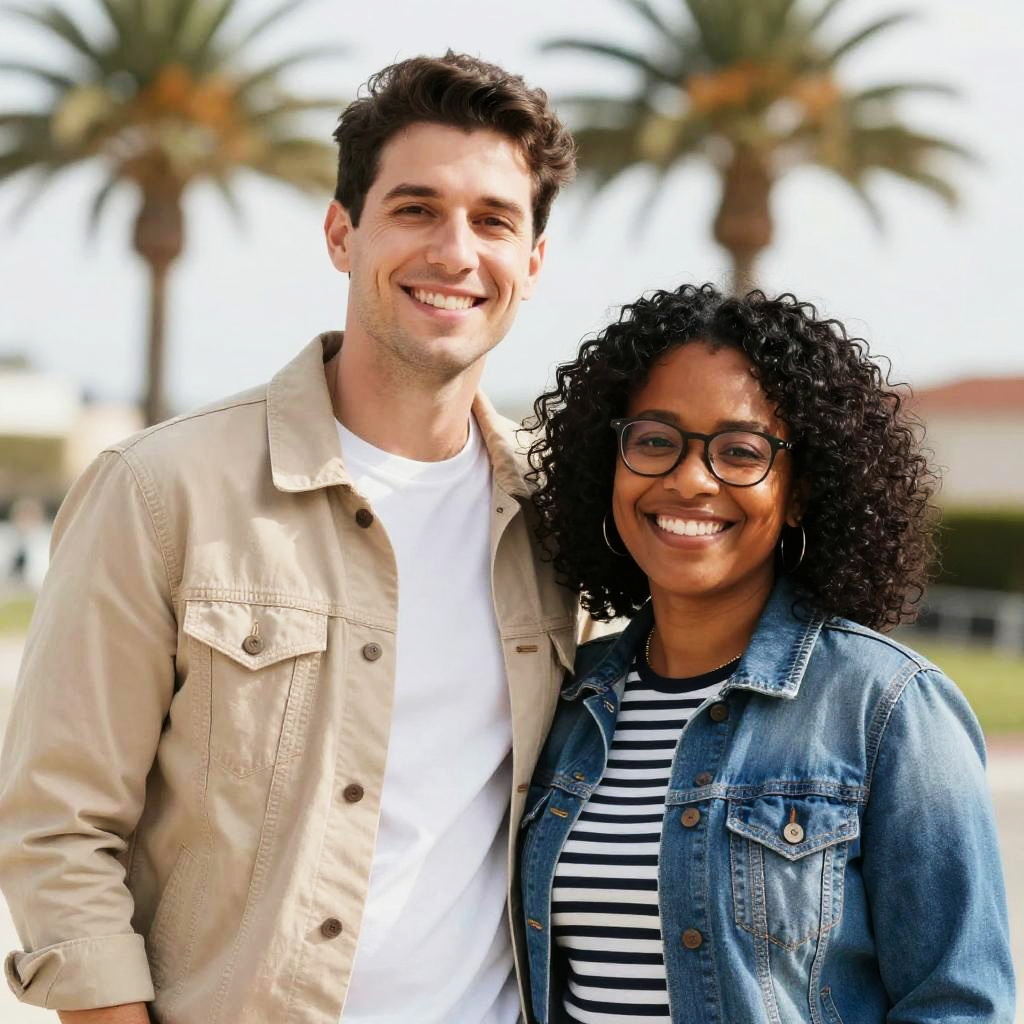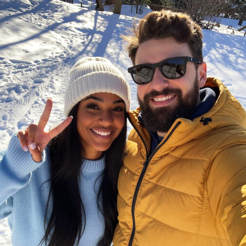 Photograph of a smiling couple taking a selfie in a snowy outdoor setting. The woman, with dark skin and long black hair, wears a light blue sweater and white beanie, flashing a peace sign with her right hand. The bearded man, with light skin and dark hair, sports a yellow quilted jacket and black sunglasses. Sunlight reflects off the snow in the background.
