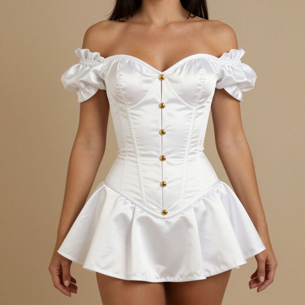 Photograph of a young woman with a light skin tone wearing a white, off-the-shoulder, puffed-sleeve dress with a fitted bodice and flared skirt. The dress features a sweetheart neckline and is adorned with five gold buttons down the center. Her long, dark brown hair falls over her shoulders. The background is a plain, beige wall. The dress has a slightly shiny, satin-like texture, and the overall style is reminiscent of a vintage or fairy tale-inspired outfit. The woman's arms are relaxed by her sides.