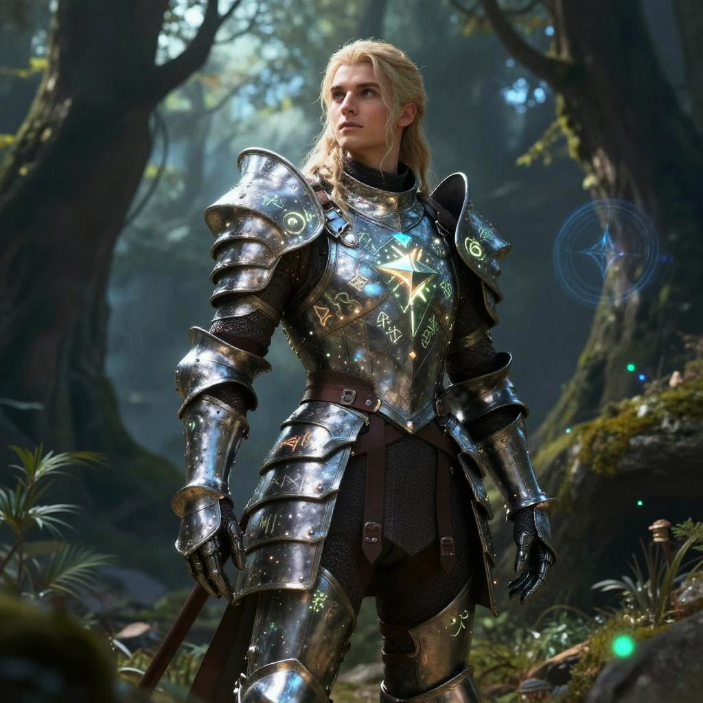 Sloan character in fantasy armor, mystical forest setting, glowing runes on armor, ethereal atmosphere, highly detailed fantasy art style