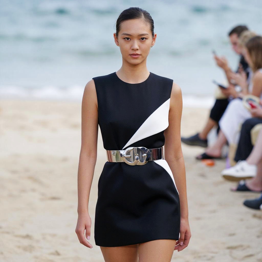 A woman in an avant-garde, sleeveless black mini dress with white asymmetrical accents and a metallic wide belt, standing at a fashion show on a sandy beach, captured in a camera obscura style. Sexy. Pretty face and beаutiful eyes. Big breasts