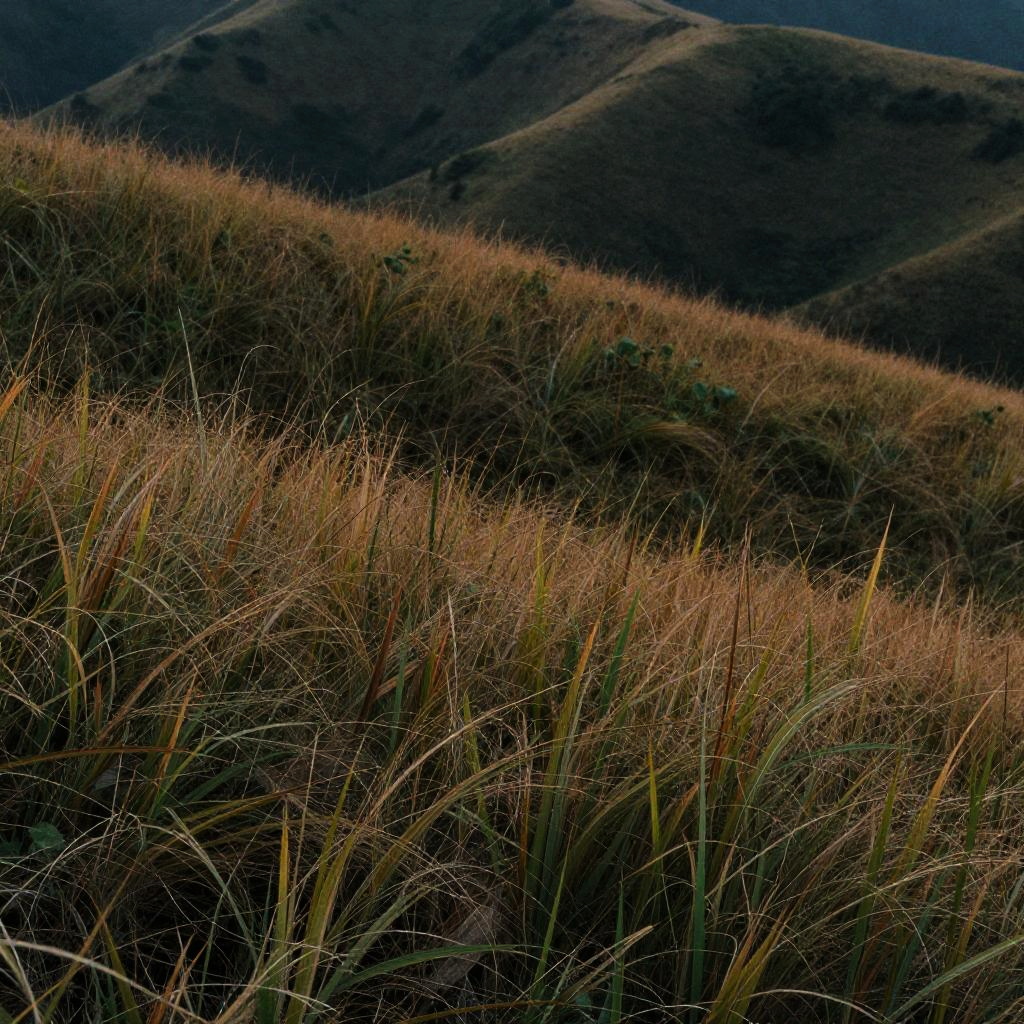 Photograph of a mountainous landscape with dark, rolling hills in the background. The foreground is filled with tall, golden-brown grasses swaying gently, illuminated by sunlight that creates sharp contrasts and shadows. The grasses have a textured, feathery appearance, with some blades standing upright while others bend slightly. The hills in the background are shrouded in shadow, adding depth and a sense of mystery to the image. The overall color palette is earthy, with rich browns and greens, and the lighting emphasizes the natural beauty and tranquility of the scene.