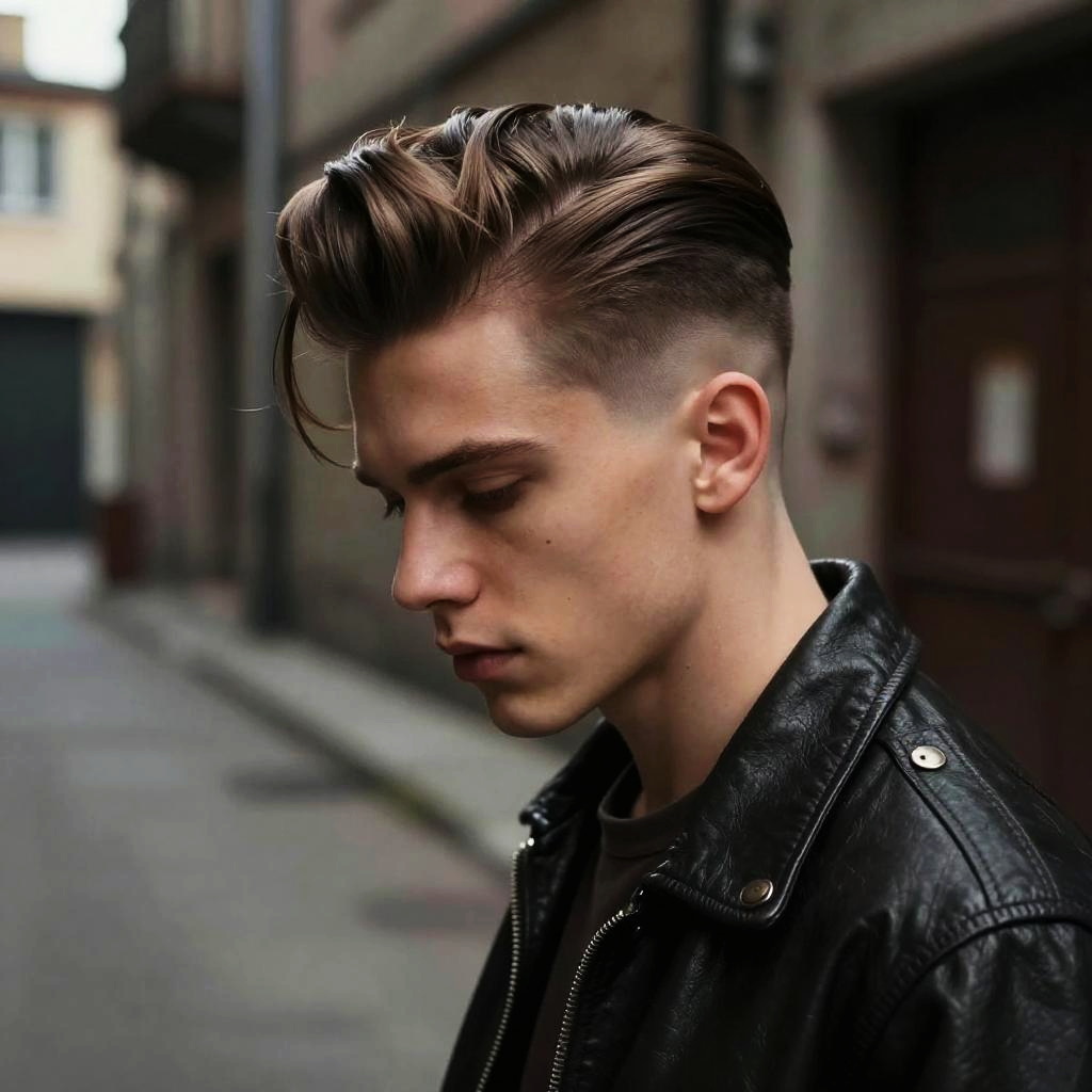 Blonde fades hairstyle on a young man showcasing a modern progressive fade with bright platinum blonde highlights, detailed close-up with textured hair strands, urban street style background, atmospheric lighting emphasizing the hair's shine and fade transitions.