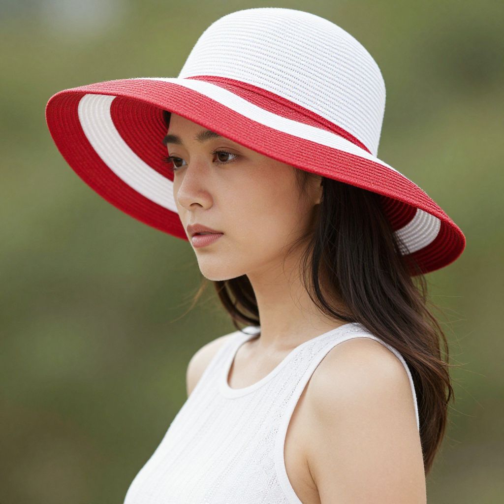 Photograph of an Asian woman with long, dark brown hair, wearing a white sleeveless top and a large, wide-brimmed sun hat with red and white stripes. She has a fair skin tone and a neutral expression, gazing slightly to the left. The background is blurred greenery, suggesting an outdoor setting. The hat's red brim contrasts with her white top, and the sunlight highlights her smooth skin. The image focuses on her upper body and face, capturing a natural, relaxed moment.