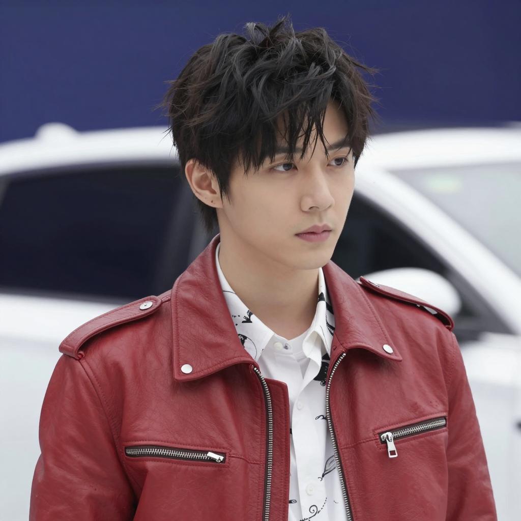 Man in white embroidered shirt and pants, standing on stage, extending right arm, red curtains in background, microphone on left, belt with silver buckle, short brown hair, mid-performance, focused expression.