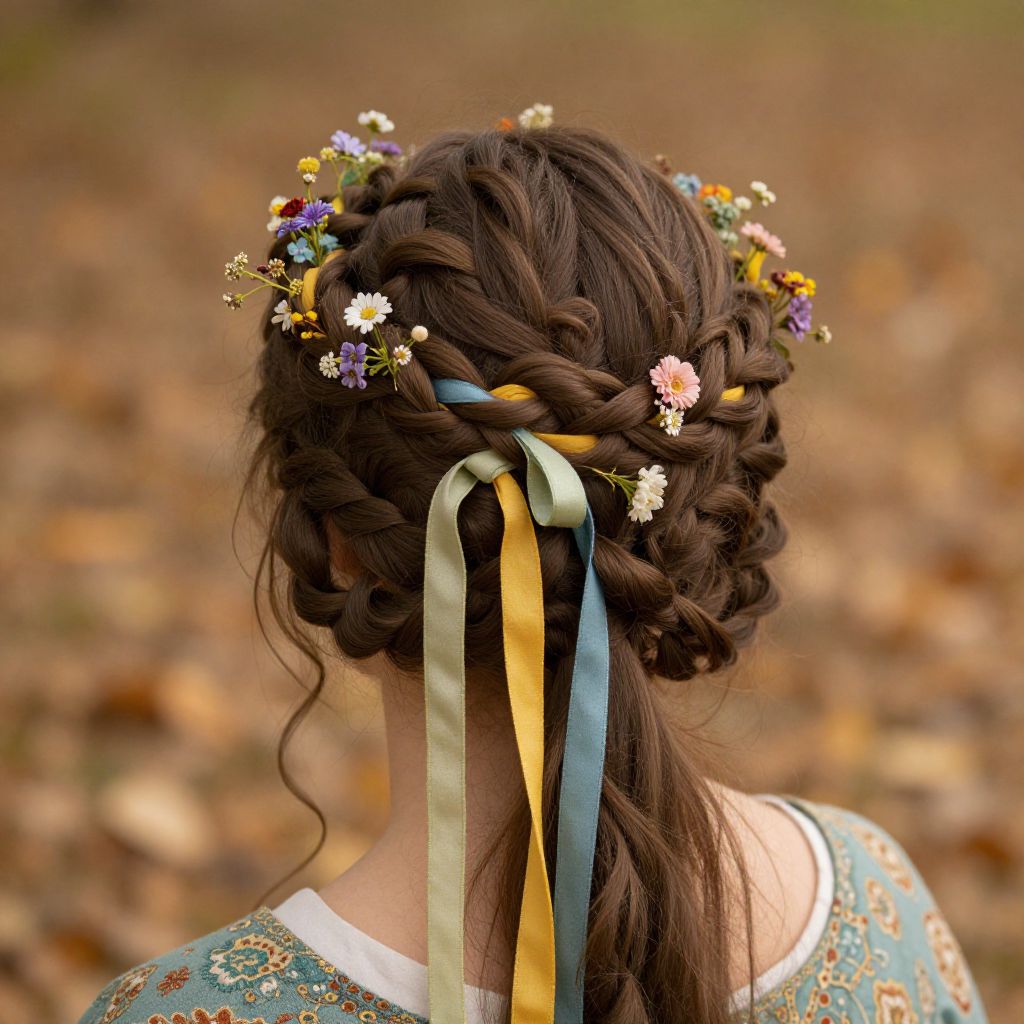 Photograph of a woman with long, wavy, brown hair, braided with white and yellow wildflowers, seen from behind, wearing a white