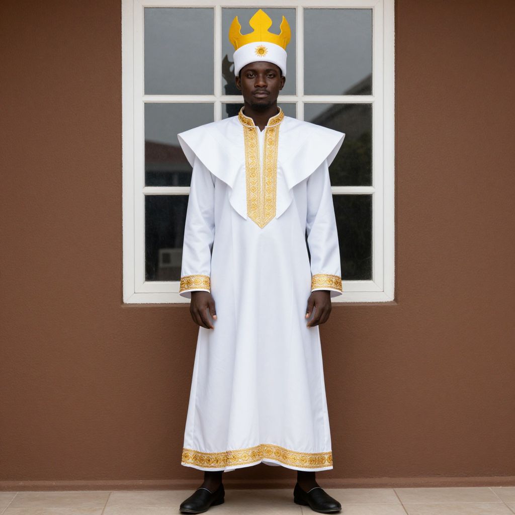 Photograph of a tall, dark-skinned man standing against a brown wall with a white-framed window. He wears a white traditional robe with gold embroidery on the chest, cuffs, and hem, and a white headwrap with an orange and yellow crown-like design. His expression is neutral, and he stands with his feet slightly apart, wearing black shoes. The background is simple, with the window reflecting some light. The overall style is formal and traditional, emphasizing the cultural attire.