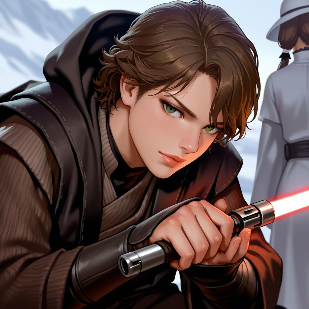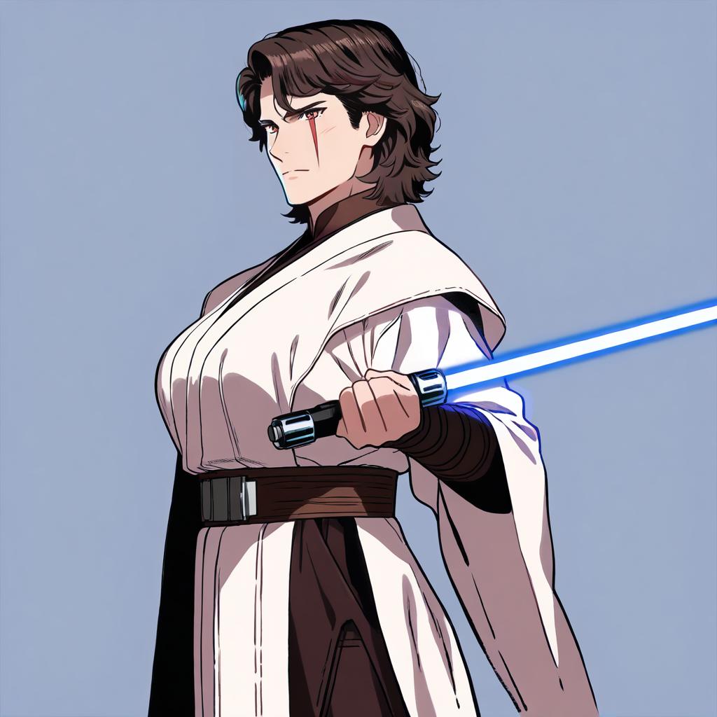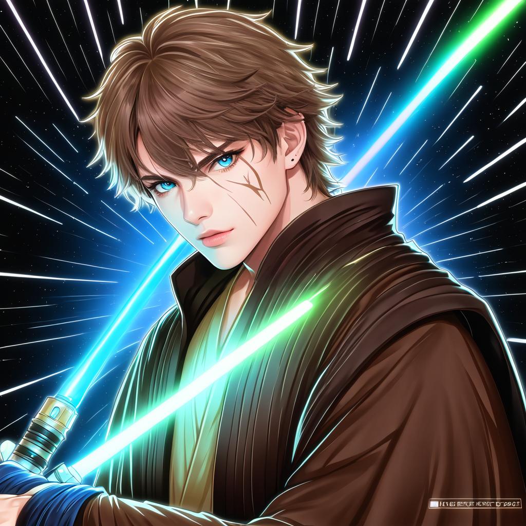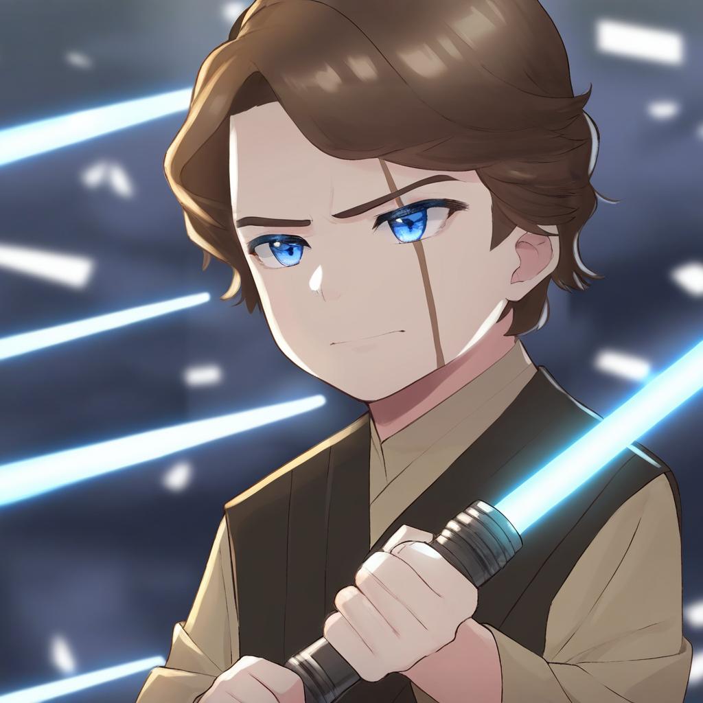 Anakin skywalker, star wars, 1boy, blue eyes, scar across eye, brown hair, short hair, jedi, lightsaber, by artist xenon (for achieve), leet