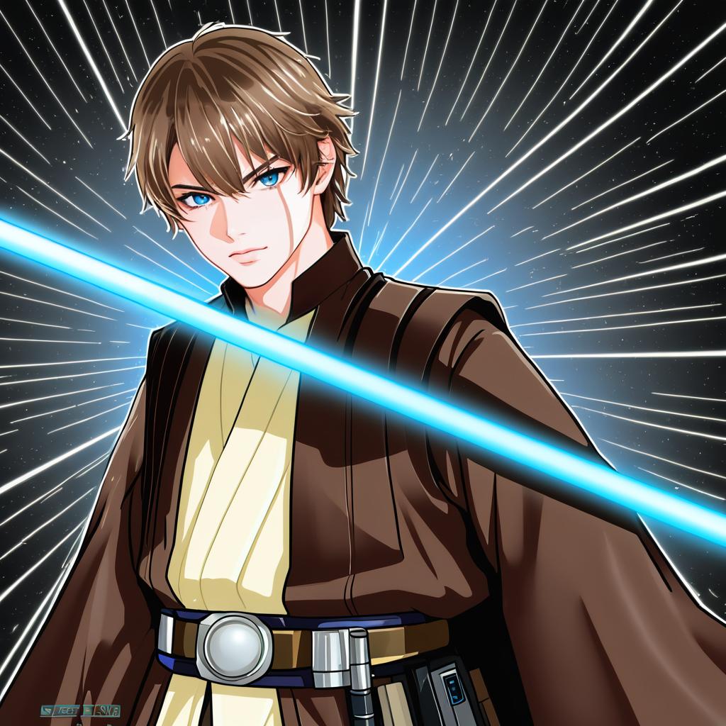 Anime-style digital illustration of a young male Jedi character with blue eyes and short brown hair, wielding a red lightsaber. The character wears traditional Jedi robes in shades of brown and black, standing confidently against a glowing, golden starry background with light streaks and sparkles. The expression is determined and energetic.