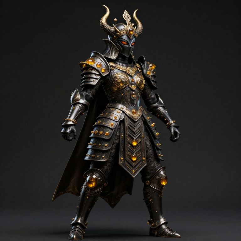 The image depicts a highly detailed and intricate depiction of a warrior goddess, likely Kali, adorned in an elaborate black armor with polished amber inlays. The armor is ornate, featuring a combination of dark metal and golden accents, creating a striking contrast. The helmet is particularly elaborate, with multiple horns and intricate designs that add to the warrior's imposing presence. The armor covers the entire body, with the chest piece being particularly prominent, adorned with detailed patterns and a central emblem. The gloves and boots are also part of the armor, completing the warrior's formidable appearance. The background is dark, which helps to highlight the warrior's figure and the intricate details of the armor. The overall composition is dynamic, with the warrior standing in a confident pose, suggesting readiness for battle. The image is a testament to the skill of Alexander Yakovlev, capturing the essence of the warrior goddess with precision and artistry.