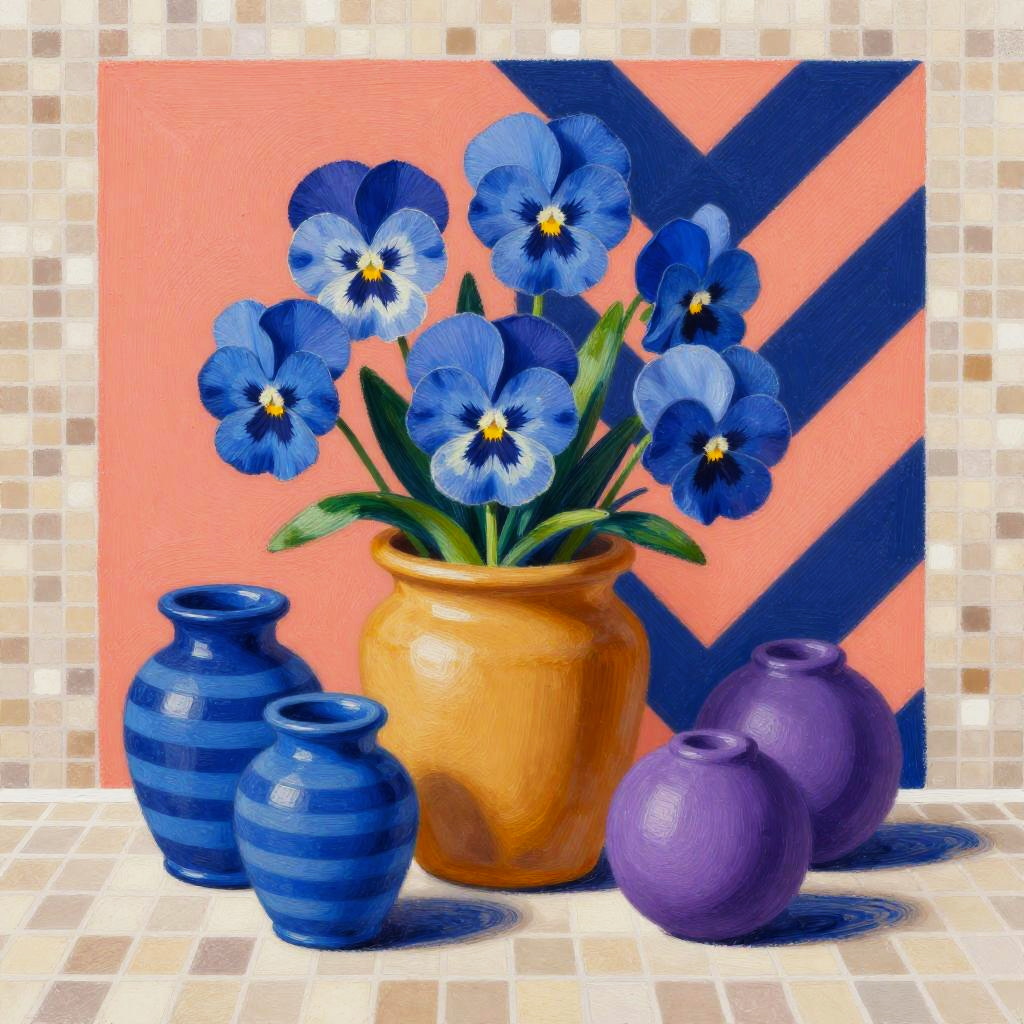 An oil pastel with vibrant contrasting strokes of blue pansies in a matte mustard pot with adjacent cobalt striped jars and purple spherical pots. Set against diagonal chevrons of coral and navy with beige mosaic walls on a tiled floor. Playful modern still life, Memphis-inspired geometry, saturated yet balanced color, clean negative space, high detail, crisp edges, soft studio lighting, cohesive composition.