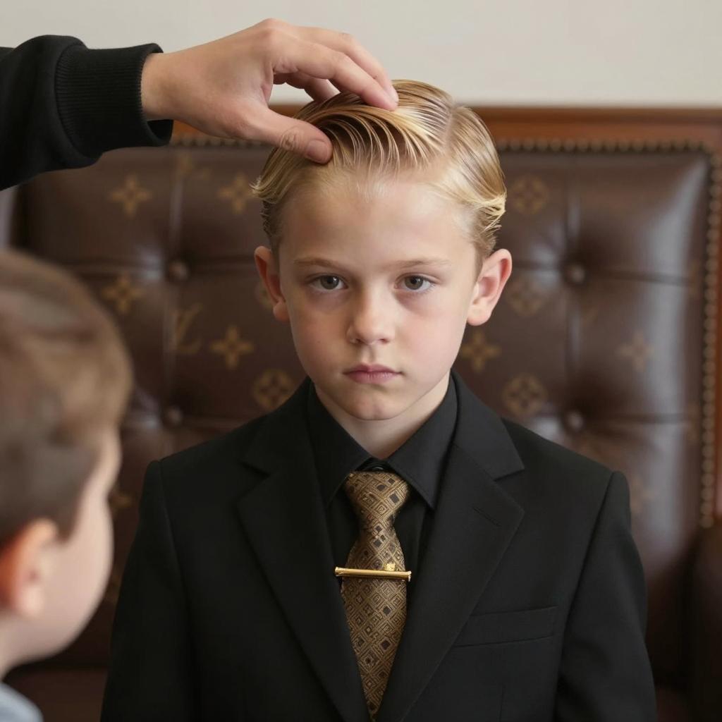 Photograph of a young boy with slicked-back blonde hair, wearing a black suit and tie with a gold patterned tie clip. A person's hand is smoothing his hair from above. The background features a brown leather seat with gold monogrammed initials. The boy has a neutral expression. Two people present, with only the boy's face and upper body visible.