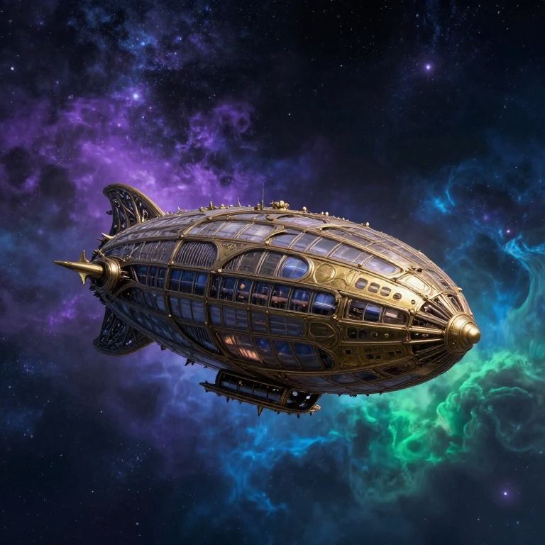 Digital artwork of a futuristic, golden airship with intricate glass windows, flying through vibrant cosmic nebulae with purple, blue, and green clouds.