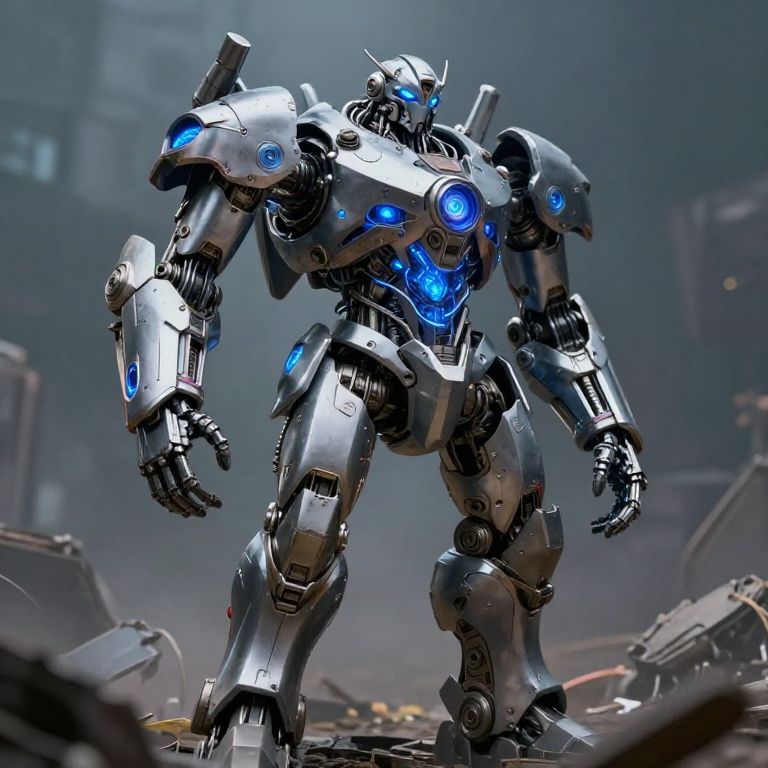 A mechanical guardian named Kilowat, standing tall in a post-apocalyptic world, combining elements of electricity and ancient machinery, with illuminated blue power cores and sleek armor, moody environment, hyper-realistic style.