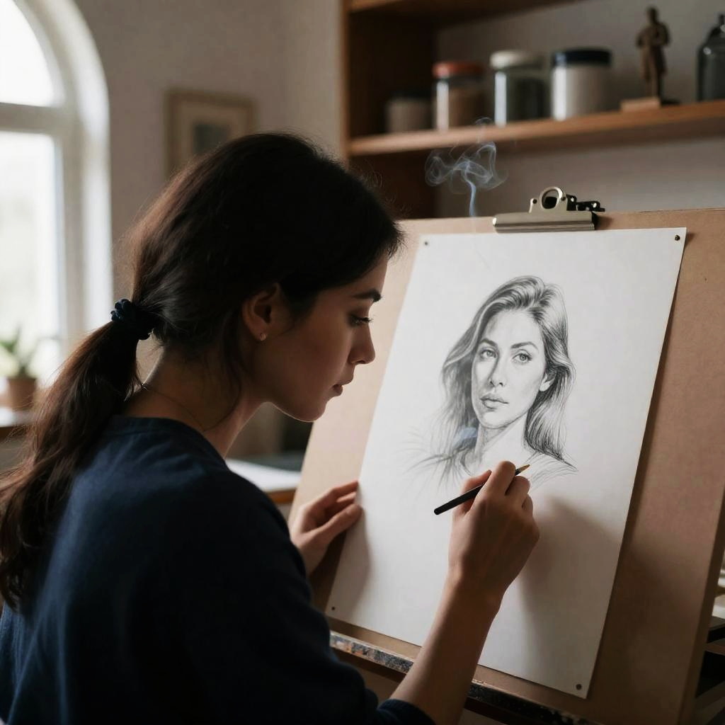 A middle-aged man with short blond hair, in a black suit, stands painting a large, abstract, ured sculpture. His feet are propped up in the foreground. The sculpture is dark with metallic and colorful swirls. The background is an unfinished, sketchy painting with shadowy figures. The man's expression is focused and serious.