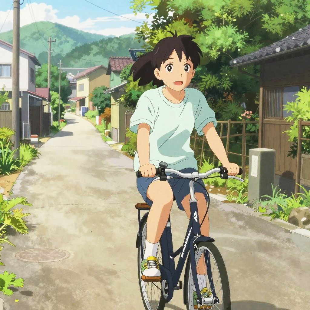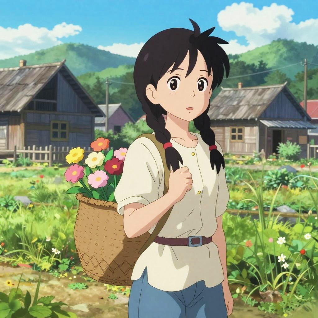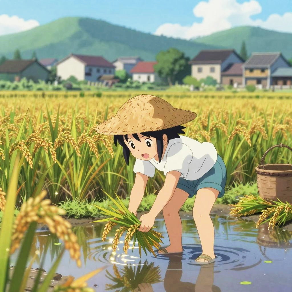 Anime village girl harvesting rice in a scenic paddy field, straw hat shading her face, water reflections shimmering, detailed and colorful rural setting, lively and cheerful mood