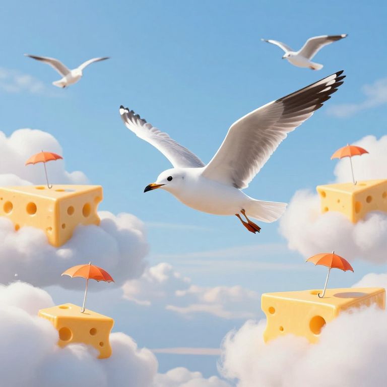 A whimsical digital illustration depicts seagulls gracefully gliding through a surreal sky adorned with tiny orange parasols, set against a backdrop of floating clouds that resemble pools of melted cheese, creating a dreamlike and imaginative scene.