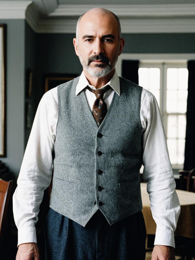 Portrait of an older bald man with grey hair and beard, wearing a grey vest, white collared shirt, and brown ascot tie. The man is standing indoors in a softly lit room, looking directly at the camera with arms relaxed at his sides. The setting includes a table and window in the background, creating a calm and formal atmosphere.