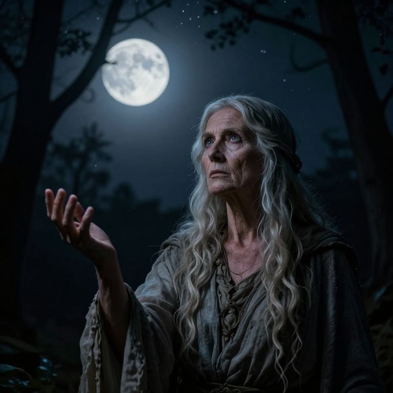 Photograph of an elderly woman with long, wavy, silver hair and deeply lined face, dressed in a tattered, earth-toned robe, standing under a dark, starry night sky with a bright full moon in the background. Her expression is solemn, and she extends her right hand, palm up, as if casting a spell or making a gesture. Silhouetted trees frame the scene, adding to the mystical, eerie atmosphere. The moonlight highlights her face and hair, creating a stark contrast with the dark surroundings.