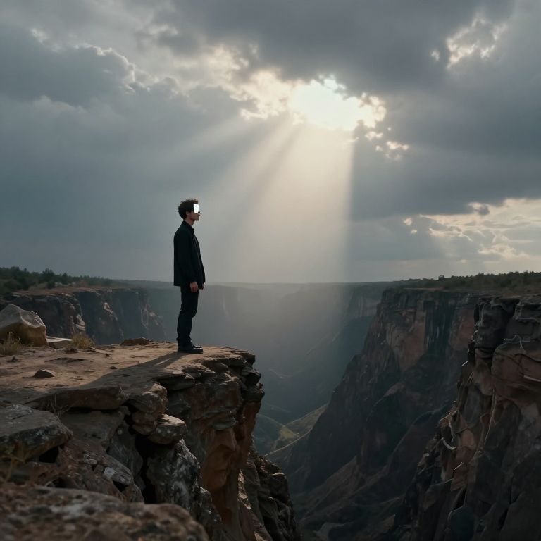 Photograph of a lone man in a black suit standing on a rocky cliff edge, gazing into a deep canyon below, with sun rays piercing through