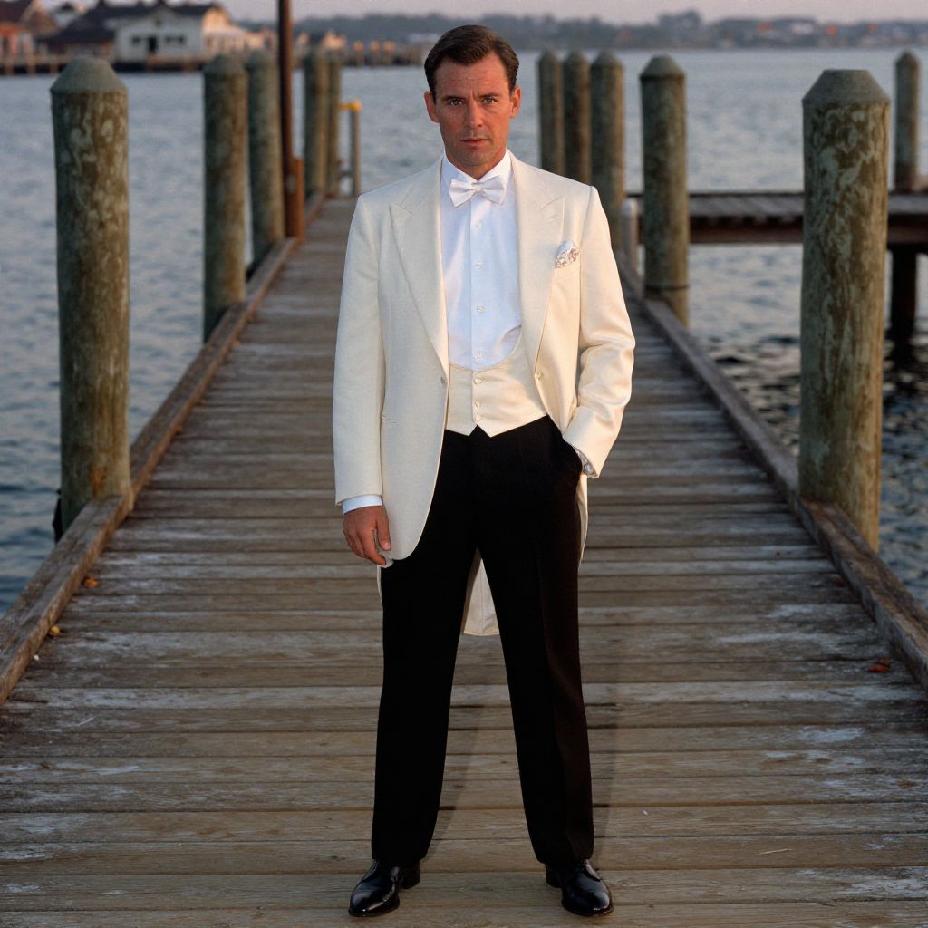 A man, midnight blue velvet suit, fitted cut, double-breasted jacket, ivory silk dress shirt, silver silk tie, black patent leather derby shoes, hydroelectric dam with rushing water, chromogenic film style, confident expression, mist rising from the river. Man has masculine face and piercing eyes
