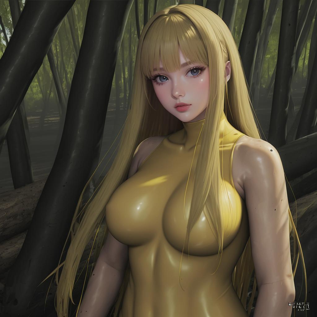 Digital anime-style portrait of a blonde woman with long hair and purple eyes, wearing a tight yellow bodysuit. The character is set against a moody forest background with dark tree trunks and green foliage, showcasing detailed skin texture and soft lighting.