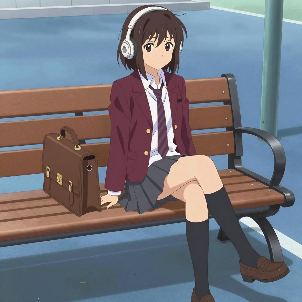 Anime-style photograph of a teenage girl sitting on a bench. She has short brown hair, wears a maroon school blazer, white shirt, striped tie, gray pleated skirt, black knee-high socks, brown loafers, and white headphones. Her right leg is crossed over her left. A brown briefcase rests on the bench beside her. Blue ground, brown metal bench, and a green pole in the background. She has a neutral expression.