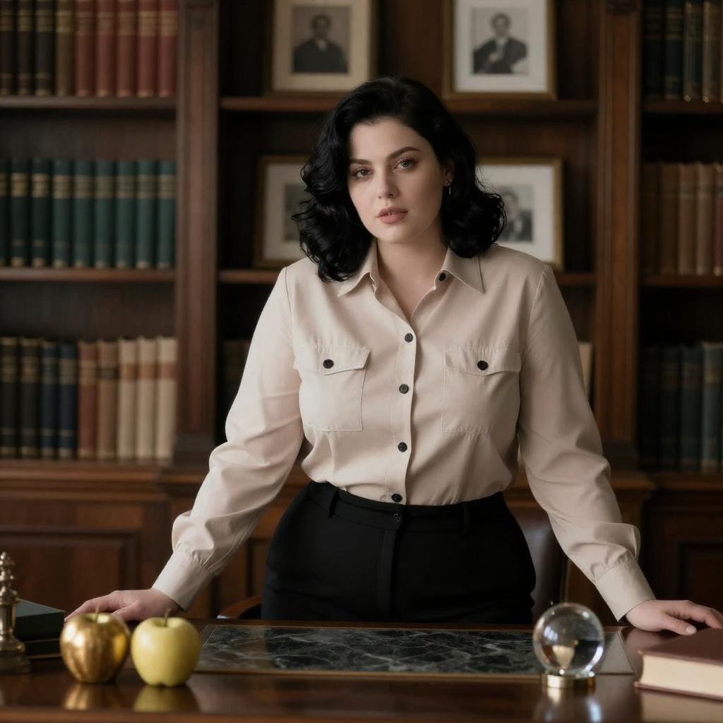 Photograph of a curvy woman with pale skin and black hair, wearing a beige blouse with black buttons and pockets, standing in a dark wooden study. She stands behind a marble-topped desk with golden apples, books, and a glass paperweight. Bookshelves and framed pictures are in the background.