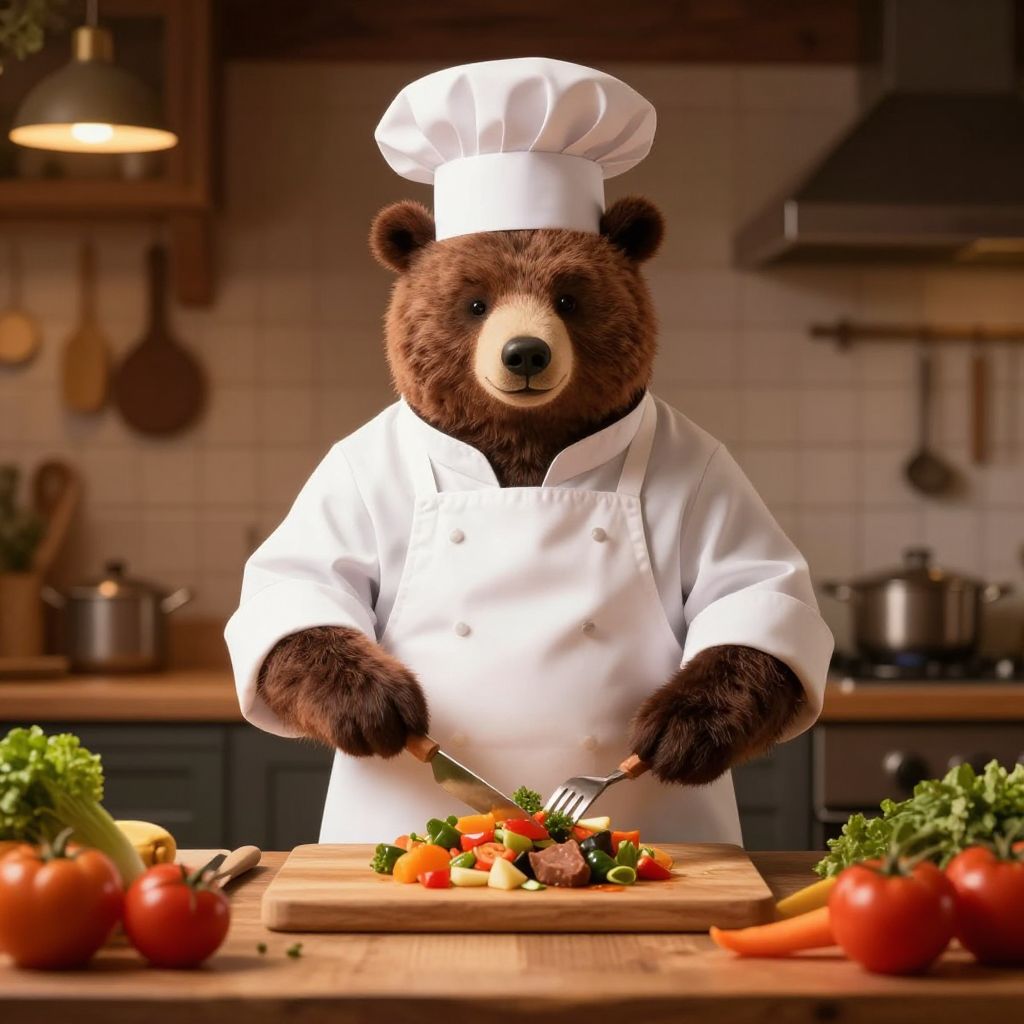 In a digitally-created photograph, a brown bear dressed in a white chef's hat and coat stands at a kitchen counter, chopping colorful vegetables, including bell peppers and green beans, on a wooden cutting board. The bear holds a knife in its right paw, focused on the task. The background features a warmly lit kitchen with wooden cabinets, hanging utensils, and a stovetop with pots. Fresh vegetables, including tomatoes and lettuce, are scattered on the counter. The bear's fur is rich and textured, contrasting with the smooth, white uniform. The overall scene blends realism with a whimsical, anthropomorphic style.