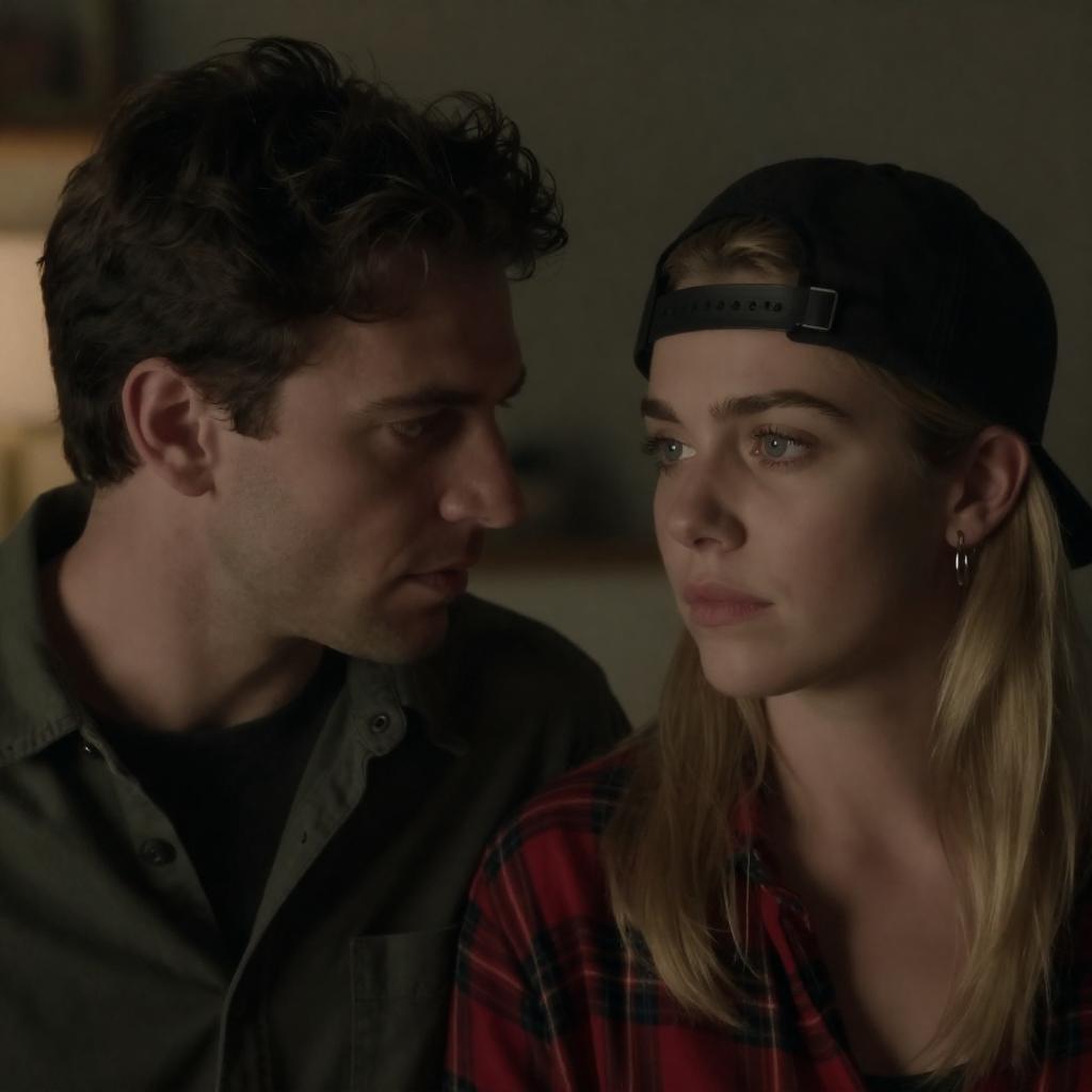 Photograph of two people with long hair, sitting closely. Man with dark hair, black shirt, neutral expression. Woman with blonde hair, beige top, slight smile. Background features intricate, circular pattern and ornate, carved designs. Warm, yellow lighting. Both looking slightly forward.