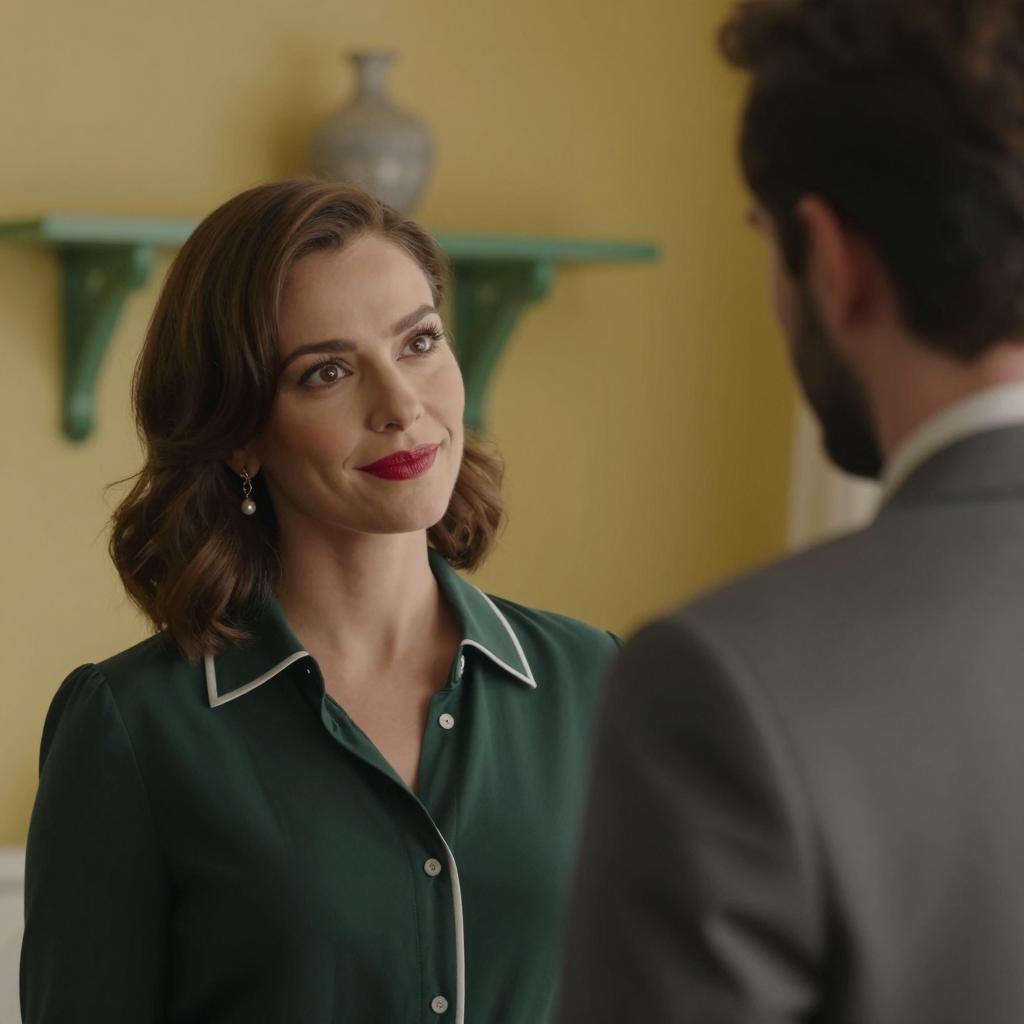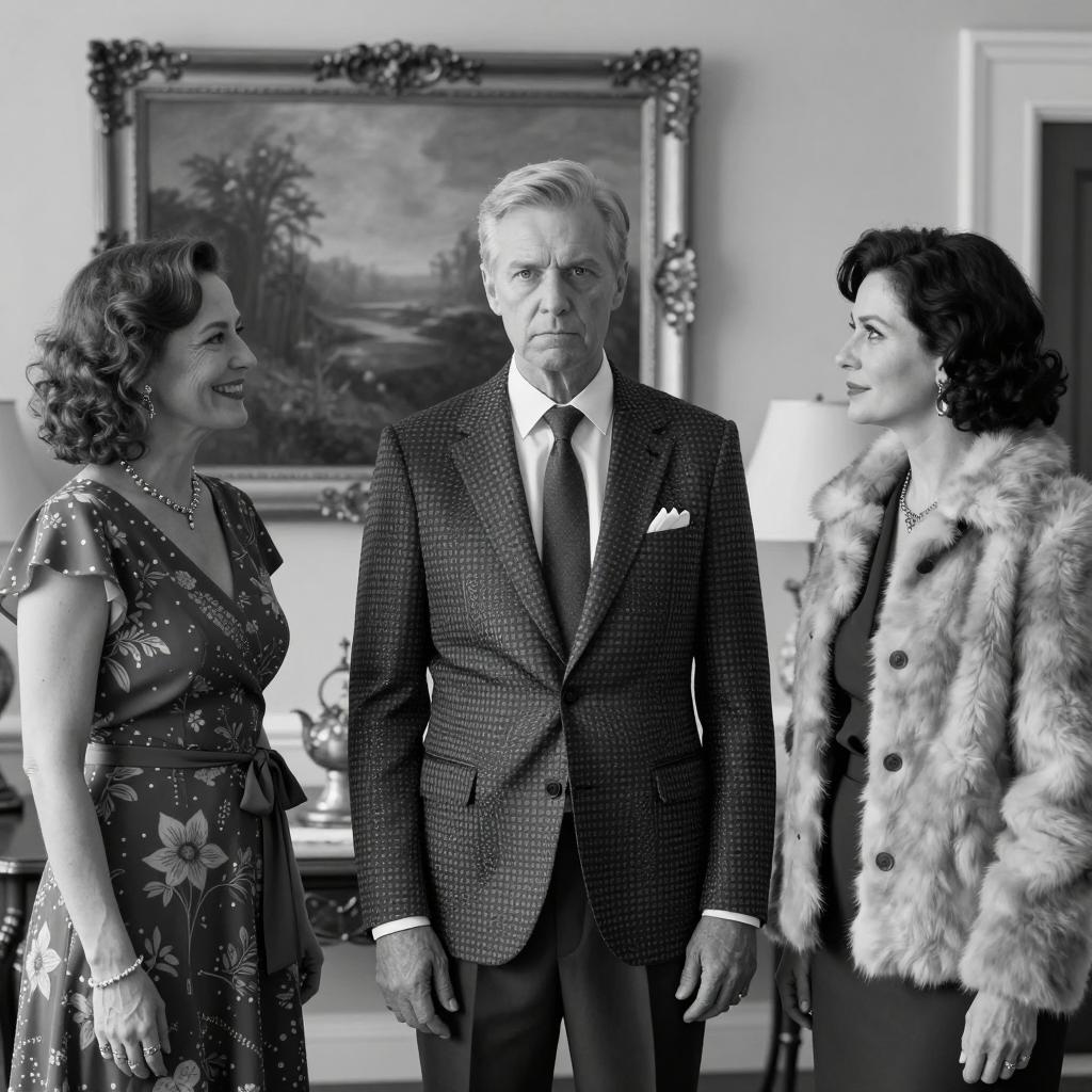 A mid-1980s scene. A man with gray hair, brown suit, and red bow tie leans towards a woman with long brown hair, black lace top, and red lipstick. Two people in the background, one in yellow and one in teal. Warm, yellow-lit room with hexagonal wall patterns. Woman looks slightly surprised, man looks engaged.