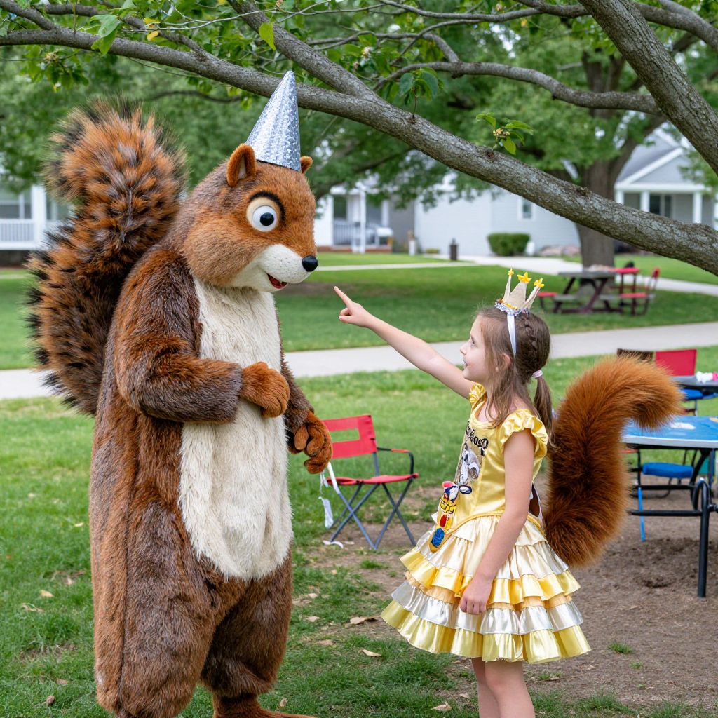 In this colorful photograph, a child dressed as a squirrel in a furry costume with a white belly and a silver party hat stands facing a young girl in a yellow, ruffled dress with a matching headband. The girl points at the squirrel costume with her right hand. They are in a grassy park with trees, red and blue chairs, and a blue table in the background. A white house is partially visible behind the trees. The image has a slightly exaggerated, playful style.