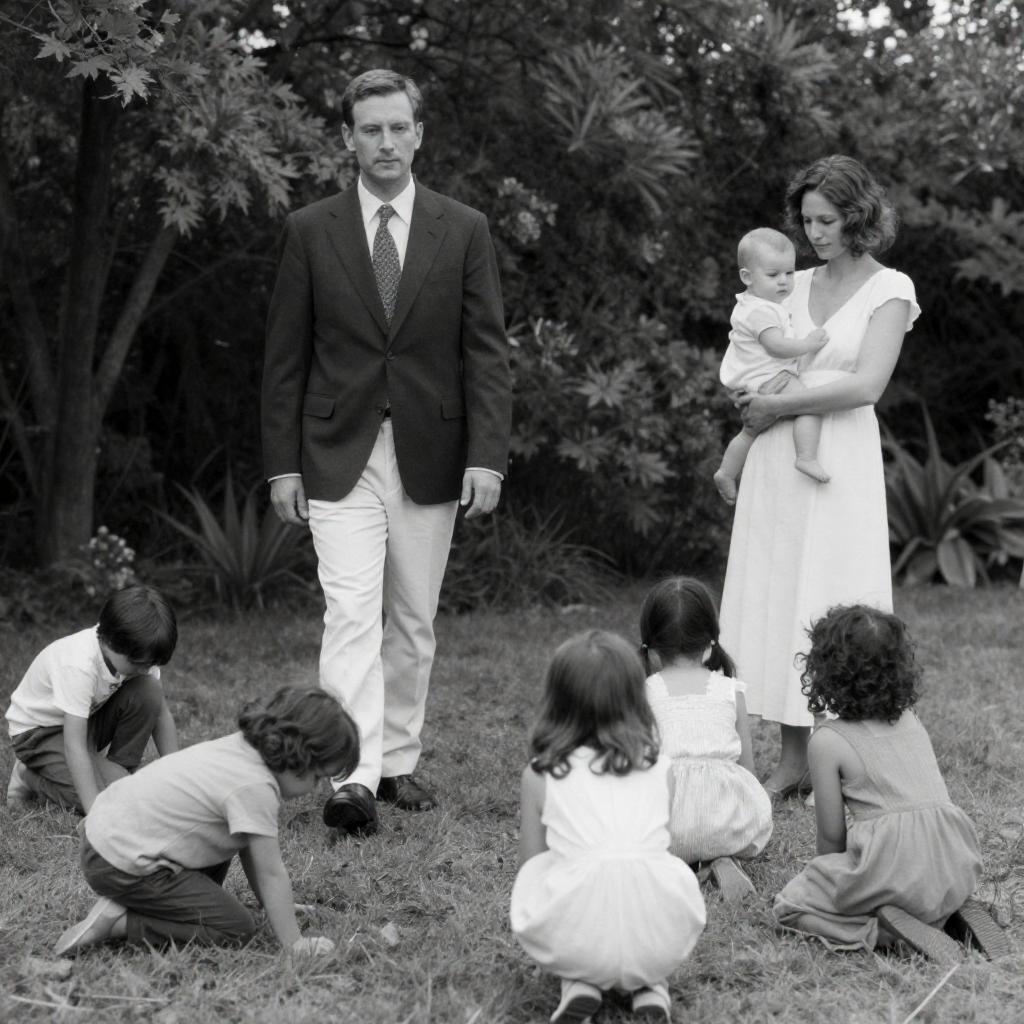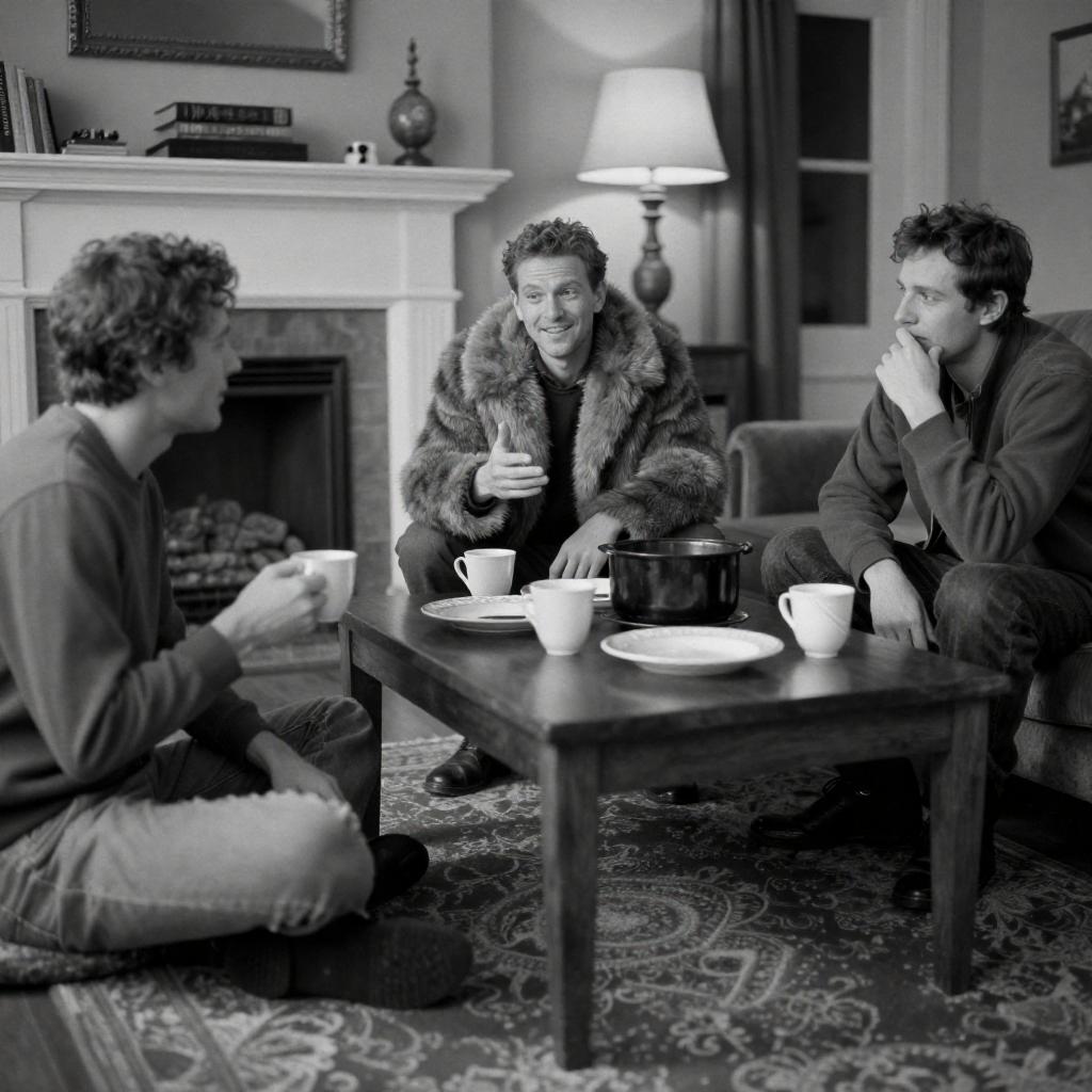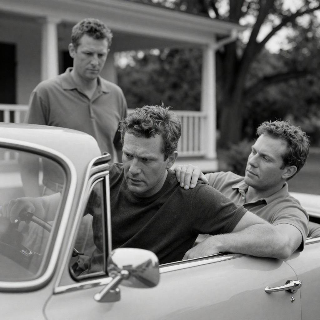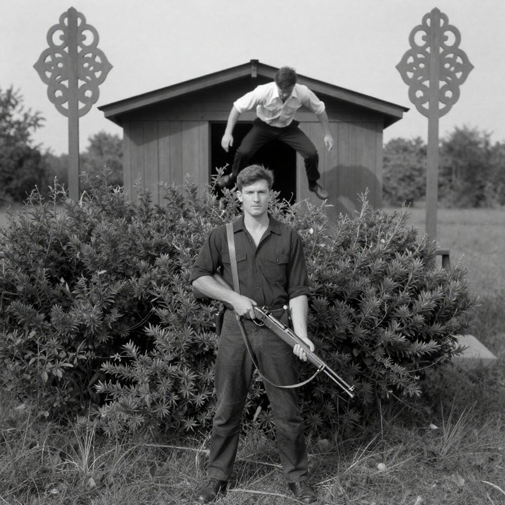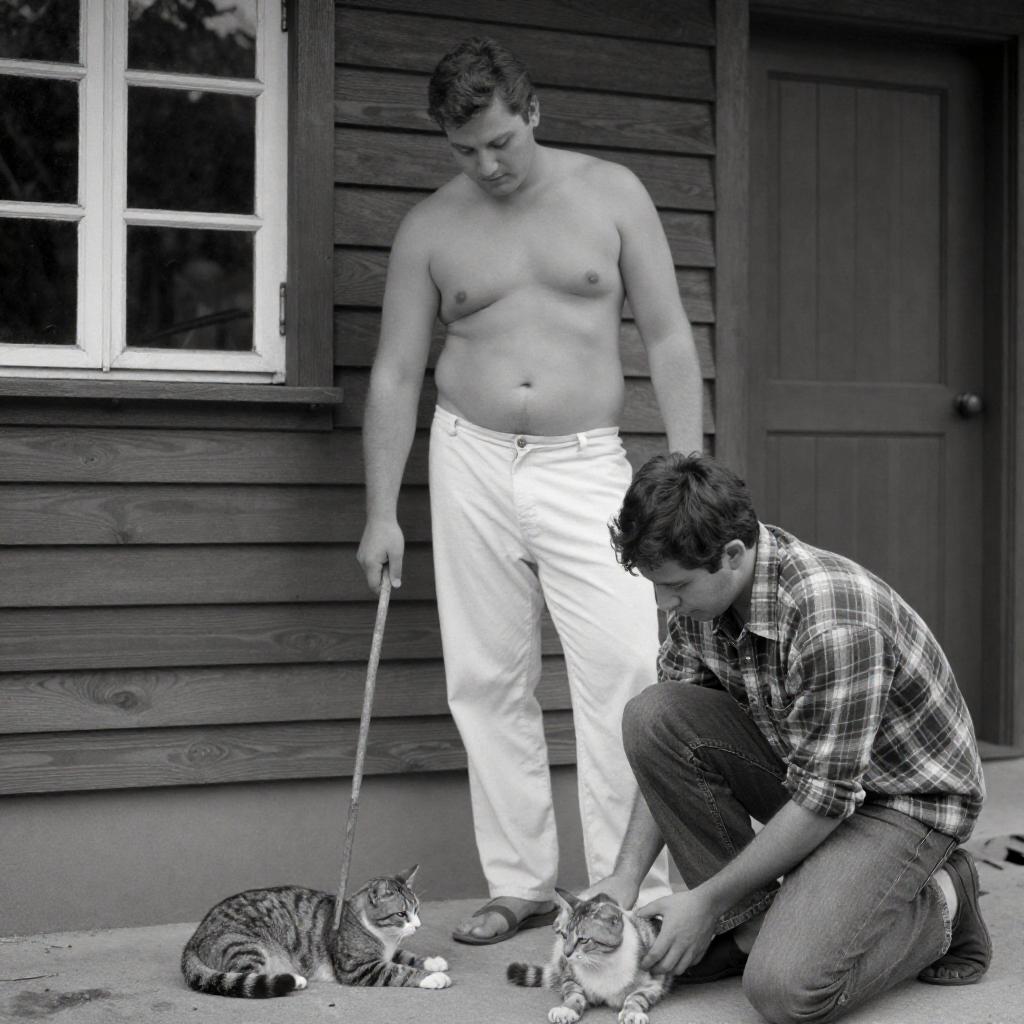 Black and white photograph of two men and a cat. Shirtless man with a large build and white pants stands, holding a stick. Kneeling man in plaid shirt and jeans attends to a lying cat. Wooden house background, window on left.