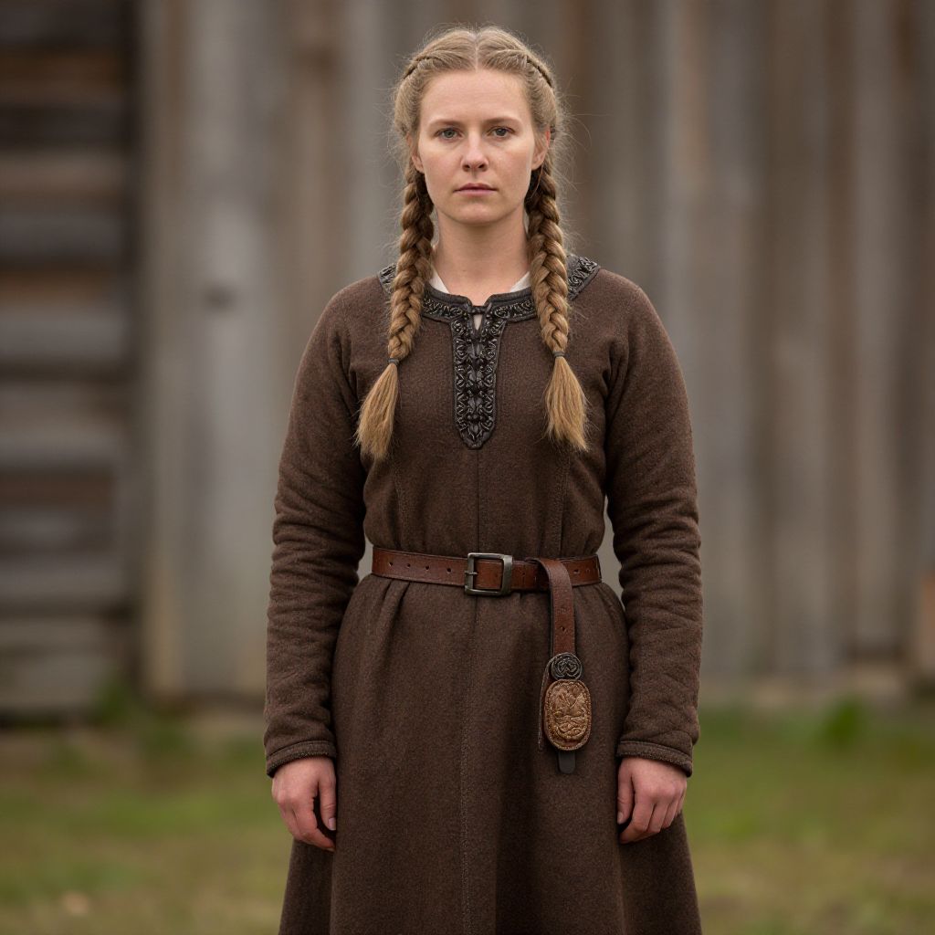 "Viking Dress Historical, woman in a brown dress with braids and a brown belt"