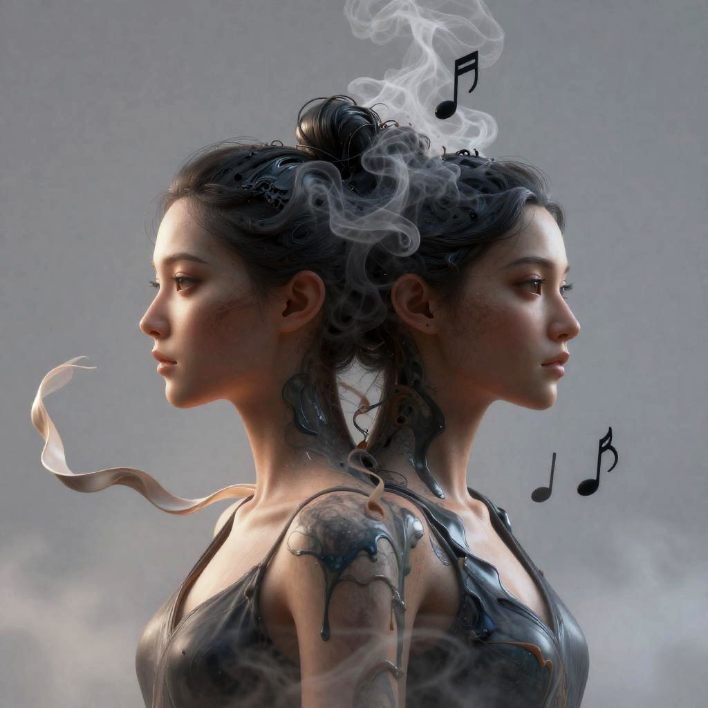 Realistic photo.3D head shot intricate portrait of the beautiful two dancer female face silhouettes mixed with liquid acrylic paint and smoke, elegant, abstract art, surrounded by flowing ribbons, musical notes, light, concept art, epic, octane render, composition by Greg Rutkowski realistic photo