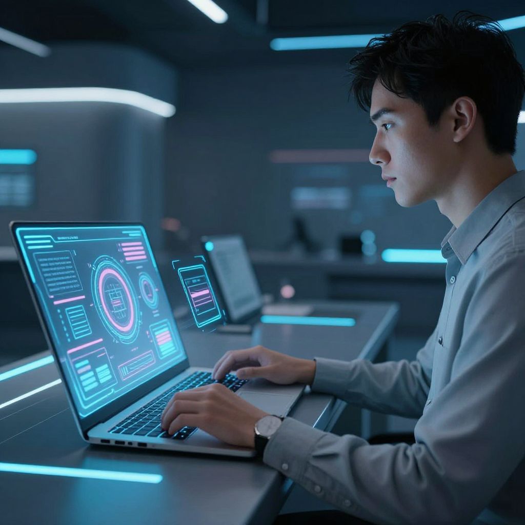 Examen scene showing a digital, futuristic environment where a person takes an electronic exam on a holographic interface, sleek modern design, neon highlights, high-tech vibe with a serious mood.
