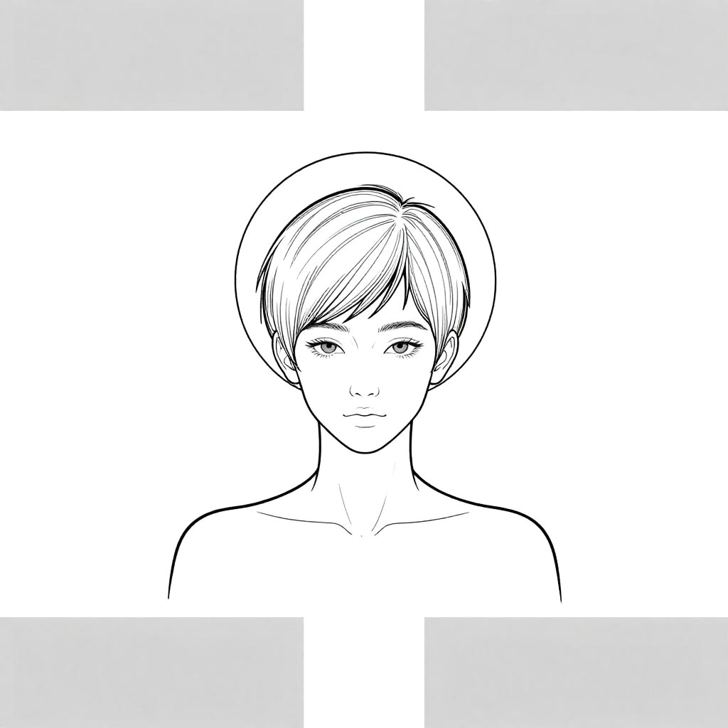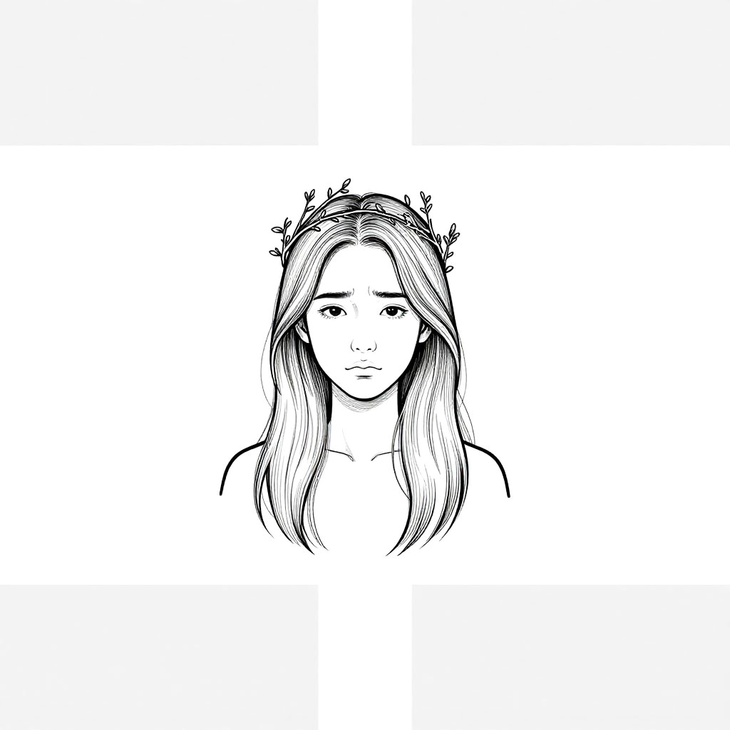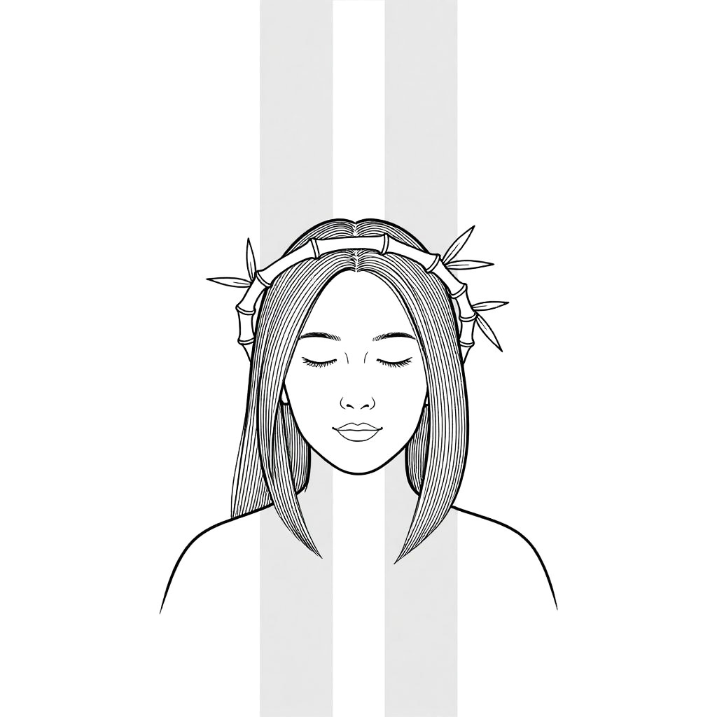 Minimalist black-and-white line portrait of teenage boy with a messy mop of hair, looking downward, adorned with woven reed circular band. A tall vertical white stripe divides the center while soft gray bands cap the top and bottom. Ultra-thin monoline, clean contours, high contrast, ample negative space, Memphis Group + monochrome sumi brush, elegant, no shading, centered composition, white background, quiet contemplative atmosphere.