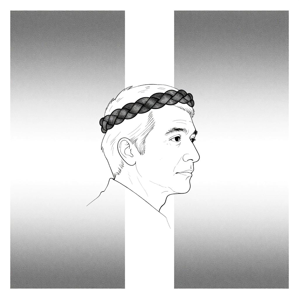 Black-and-white minimalist line drawing of a teenage boy with messy hair looking downward. The boy wears a woven reed circular headband. The composition features ultra-thin clean contours with high contrast and ample negative space. A tall vertical white stripe divides the center with soft gray bands at top and bottom on a white background.