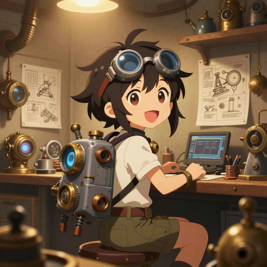 Anime-style drawing of a young boy with black hair, goggles, and a steampunk backpack, sitting at a cluttered workshop desk, smiling,