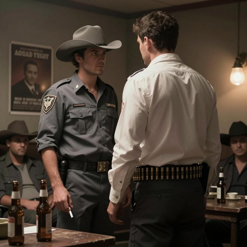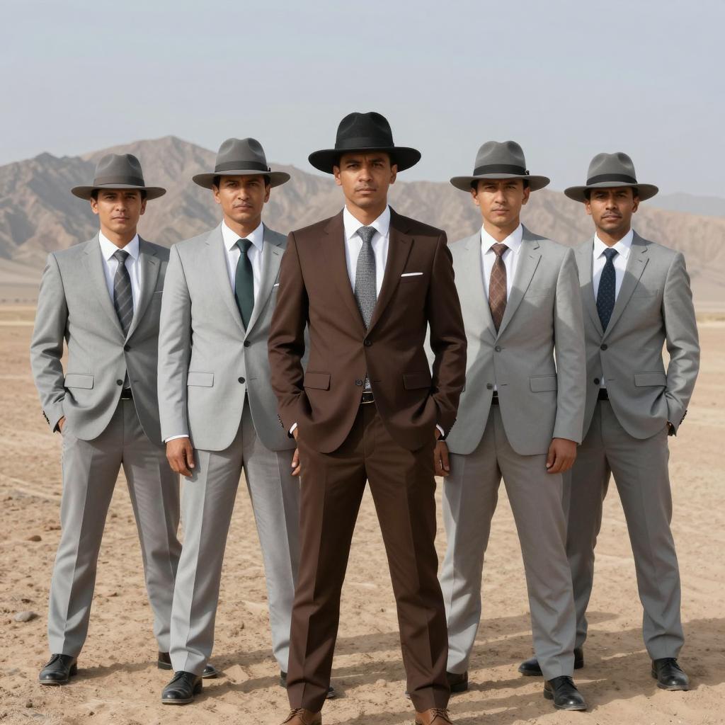 Three men in a car. Left: dark-haired man in black suit and hat, serious expression. Center: man with short dark hair, tan shirt, arm resting on steering wheel, intense gaze. Right: man in brown suit, gray shirt, brown hat, focused expression, holding steering wheel. Background: car interior.