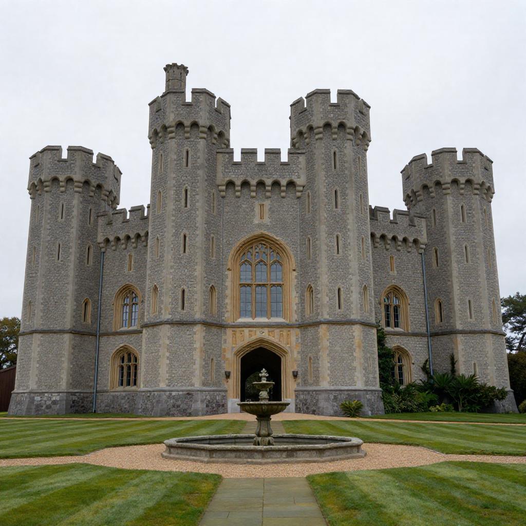 Photograph of a large, medieval-style castle with grey stone towers and crenellated battlements. Central entrance with arched windows. Four tall towers, two on each side. Green lawn in foreground with small stone fountain. Overcast sky. Dense greenery around castle base.