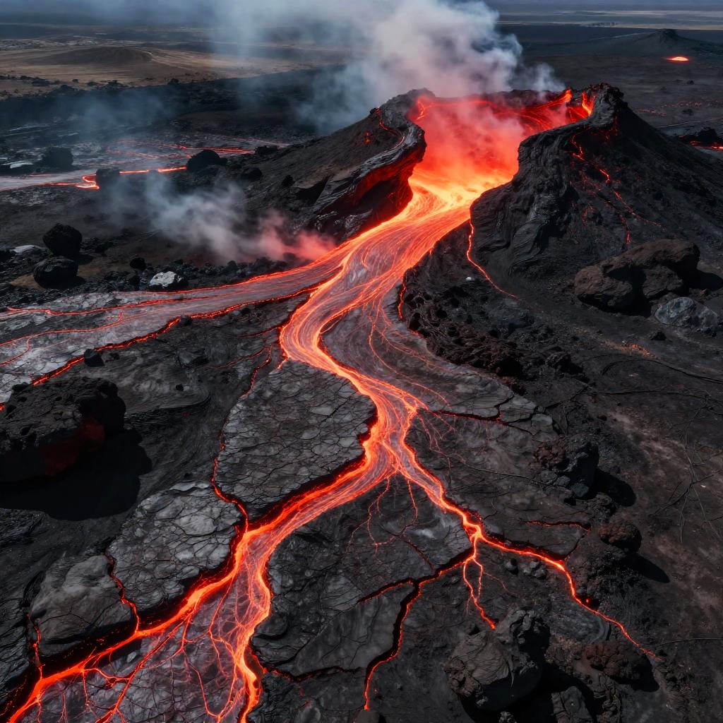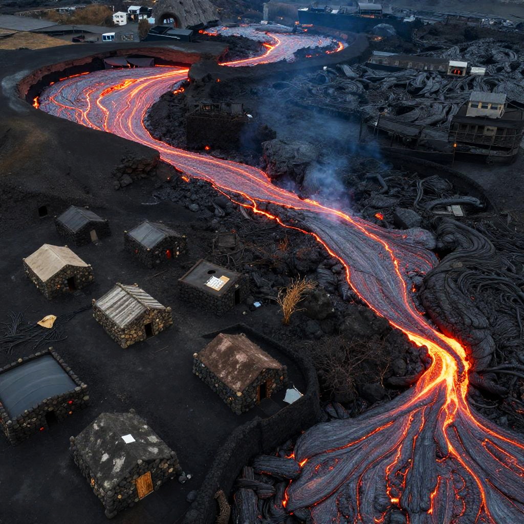 An volcanic lava village, viewed from above. stone huts, glowing lava streams.