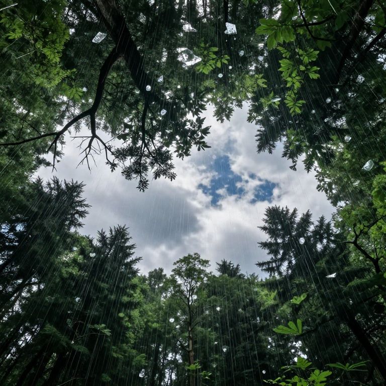 A forest grows upside down from the sky, with trees rooted in clouds and leaves sparkling like shattered glass, casting rain that falls upward.