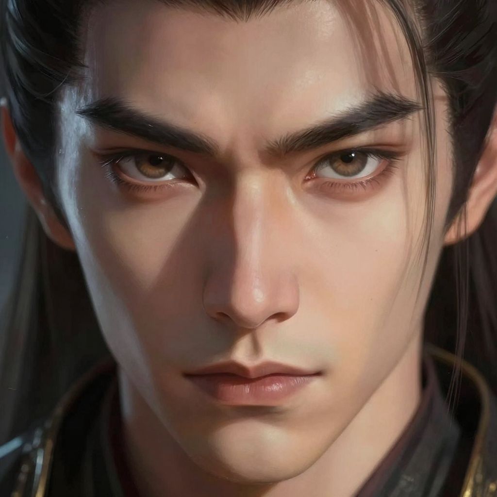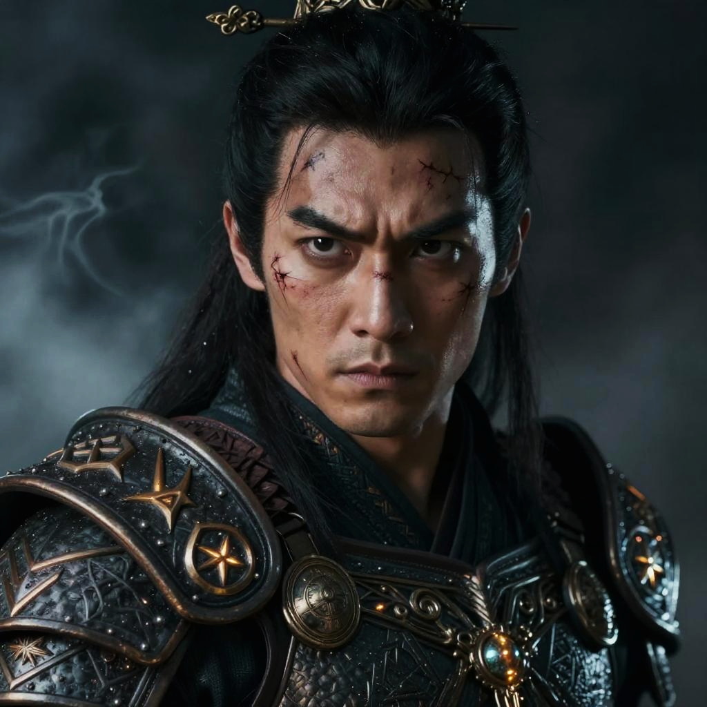 Photograph of a close-up, serious-faced Asian man with medium-length black hair and dark eyebrows. His skin is light brown, and his eyes are focused with a determined expression. The lighting is dramatic, casting shadows across his face, highlighting his forehead and cheekbones. He is wearing a dark-colored shirt, and the blurred background is dark, keeping the focus on his intense gaze. The image has a realistic style, capturing detailed textures of his skin and hair.