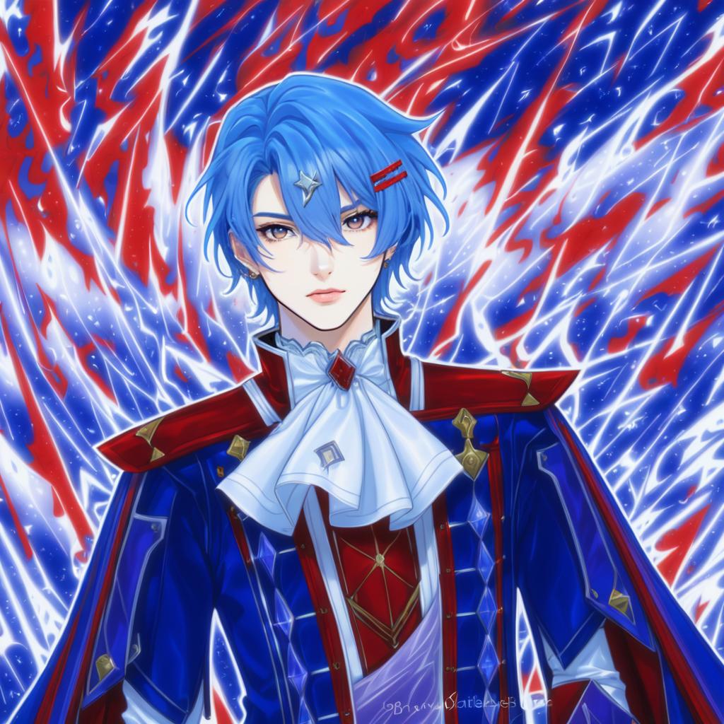 Digital anime-style portrait of a young male character with short, asymmetrical blue hair adorned with red hairclips and a silver star-shaped accessory. He has red eyes and a fair complexion. The character wears a detailed blue and red jacket with golden accents, a white ascot with ruffles, and a red gemstone brooch. The vibrant background features dynamic streaks of red, white, and blue light creating an energetic atmosphere.