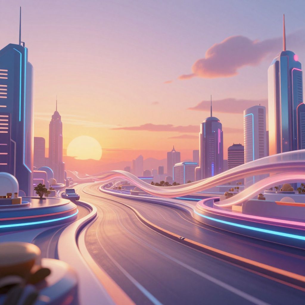 This digital artwork depicts a futuristic cityscape at sunset. The sky is painted with warm hues of orange, pink, and purple, contrasting with the cool blue and purple lights of the city. Tall skyscrapers with sleek, modern designs dominate the background, with a prominent building on the right featuring a spire. In the foreground, a winding highway is illuminated by long-exposure light trails, creating dynamic curves of white and pink. A dome-shaped building is visible on the left, and a few small trees punctuate the urban landscape. The image captures a sense of motion and modernity, with smooth, reflective textures on the buildings and a glowing, vibrant atmosphere.