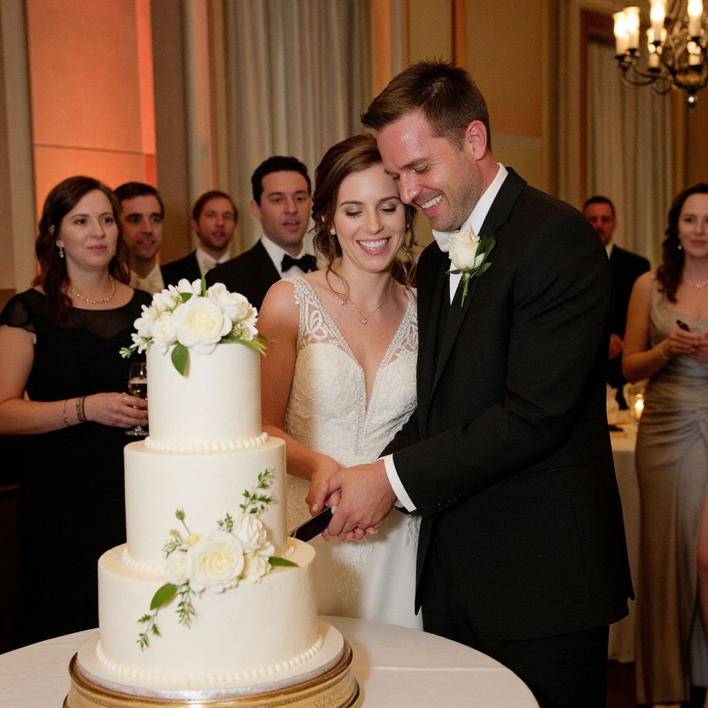 Photograph of a smiling bride and groom cutting a three-tiered white wedding cake with white roses, surrounded by guests in formal attire.