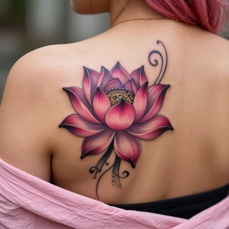 Photograph of a woman's back with a vibrant pink and purple lotus flower tattoo, black swirls, and pink shirt slipping off.
