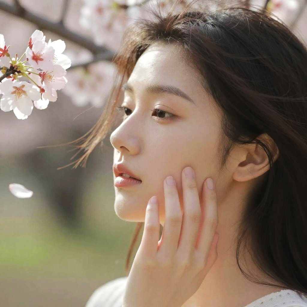 Photograph of an Asian woman with fair skin and long, dark brown hair. She gazes thoughtfully to the left, her right hand gently touching her cheek. Her face is softly illuminated by sunlight filtering through blooming cherry blossoms in the background. Her lips are slightly parted, and her expression is serene. She wears a white, floral-patterned top, and the blurred background includes green grass and a tree branch with pink and white flowers. The light creates a delicate, ethereal atmosphere, highlighting her smooth complexion and delicate features.