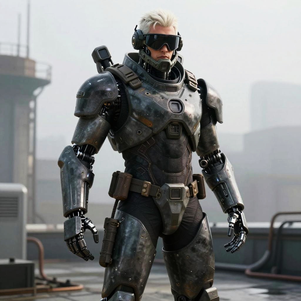 A cyberpunk scene featuring a broad-shouldered male cybernetic mercenary with platinum blonde hair and a robotic arm, set in a fog-filled industrial rooftop, wearing heavy-duty exoskeleton armor and visored helmet, hyper-realistic, ray tracing, dynamic lighting, high detail